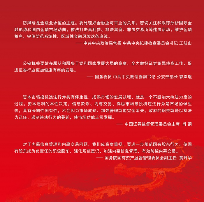 内幕交易是资本市场的顽疾,侵蚀和破坏市场公开、公平和公正的基本原则,严重损害了投资者尤其是中小投资者的合法权益。近年来,我国资本市场内幕交易呈现高发态势,已经影响到资本市场改革与发展的进程。在中央纪委、最高法、最高检的大力支持下,中国证监会、公安部、监察部、国资委和预防腐败局等有关部委在打击和防控内幕交易方面积极开展工作,成效显著,但要从根本上防治内幕交易依然任重道远,需要全社会的广泛参与和大力支持。